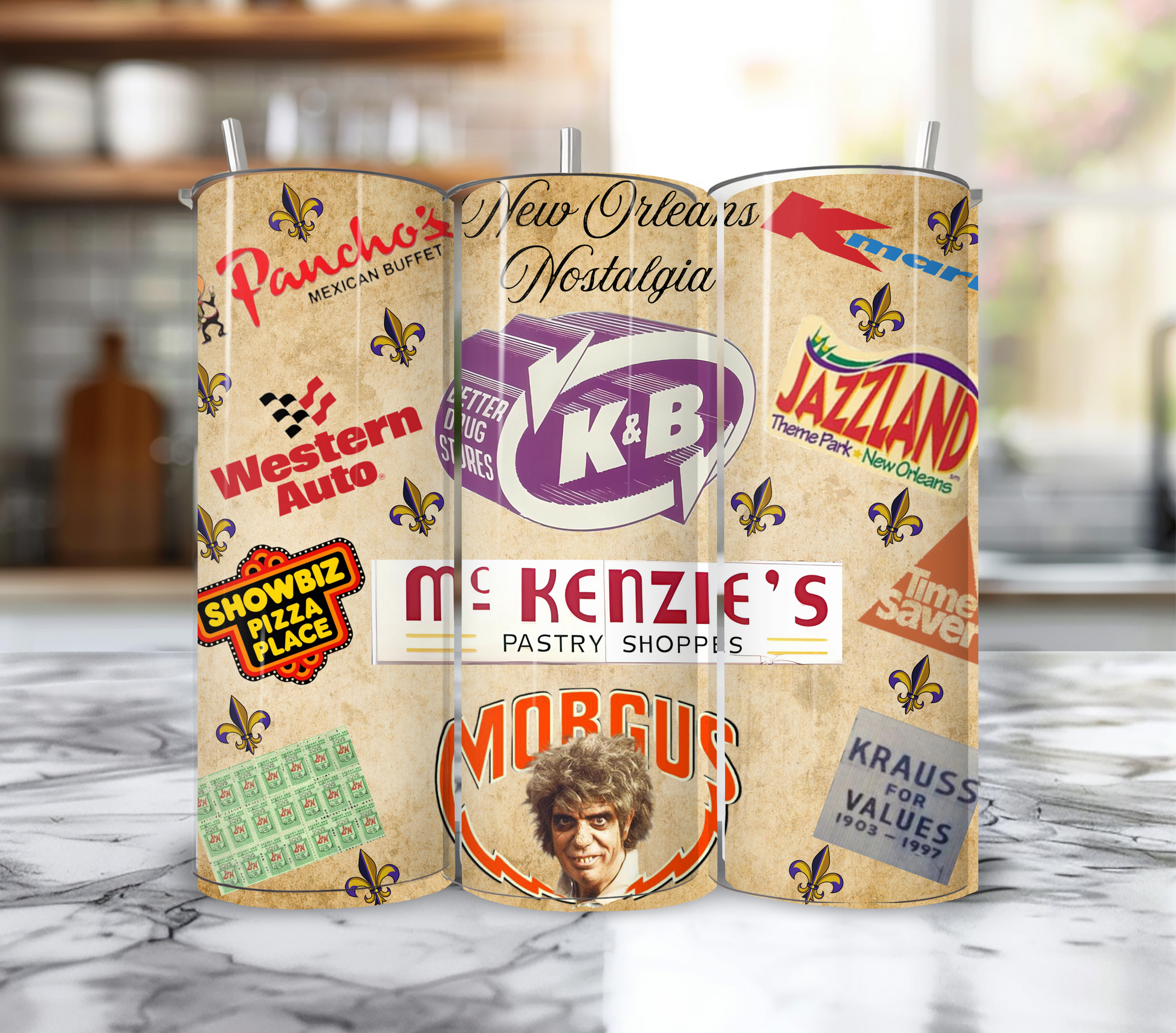 Take a trip down memory lane with this custom 20oz tumbler packed full of beloved New Orleans icons. Whether it was birthday parties at Showbiz Pizza, shopping trips to K&B, or rides at Jazzland, this design brings back all the best memories of growing up in the Crescent City.
